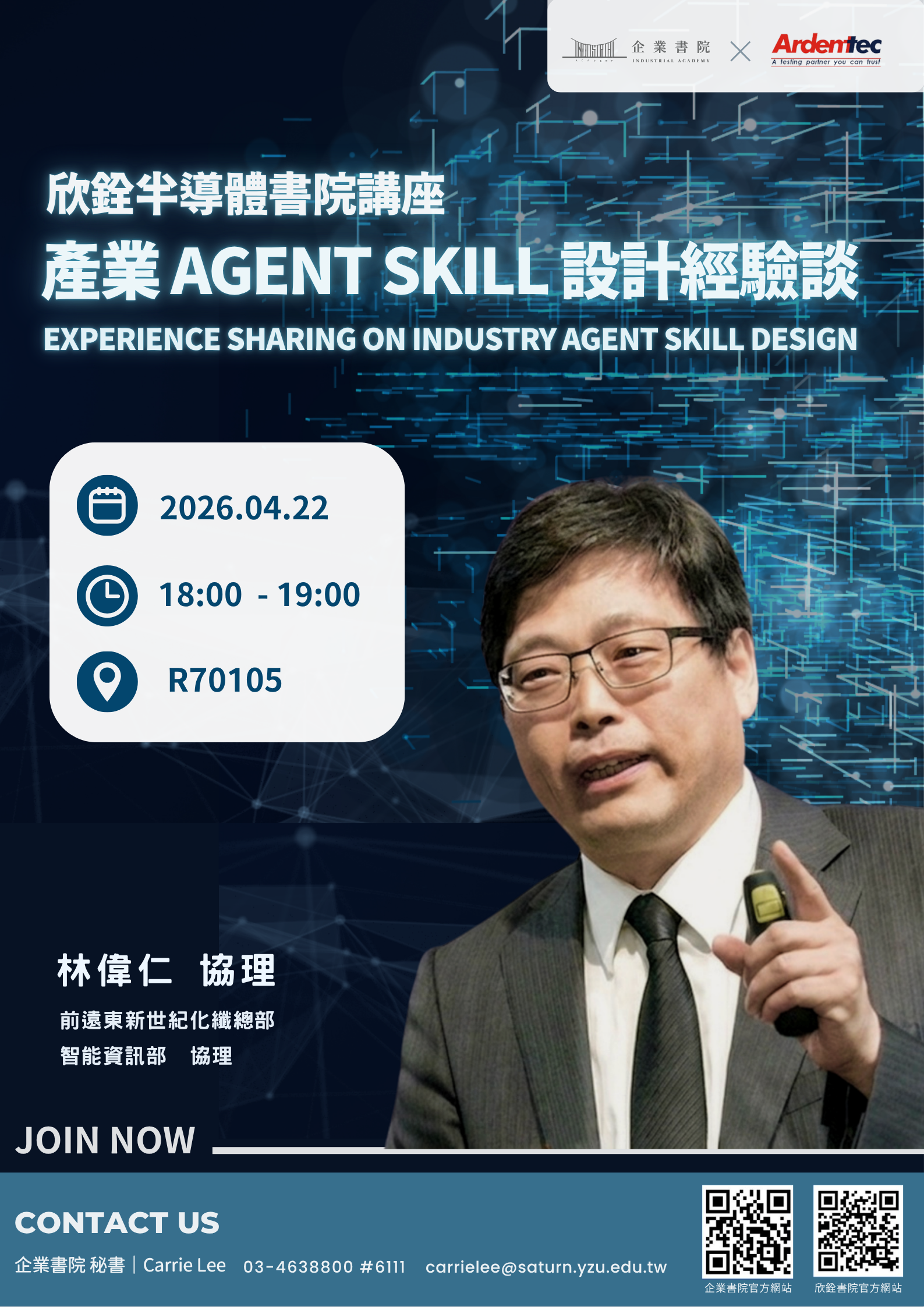 本次企業書院特別邀請到 前遠東新世紀化纖總部 智能資訊部 林偉仁 協理,為我們帶來 「產業 AGENT SKILL 設計經驗談(EXPERIENCE SHARING ON INDUSTRY AGENT SKILL DESIGN) 」!💼