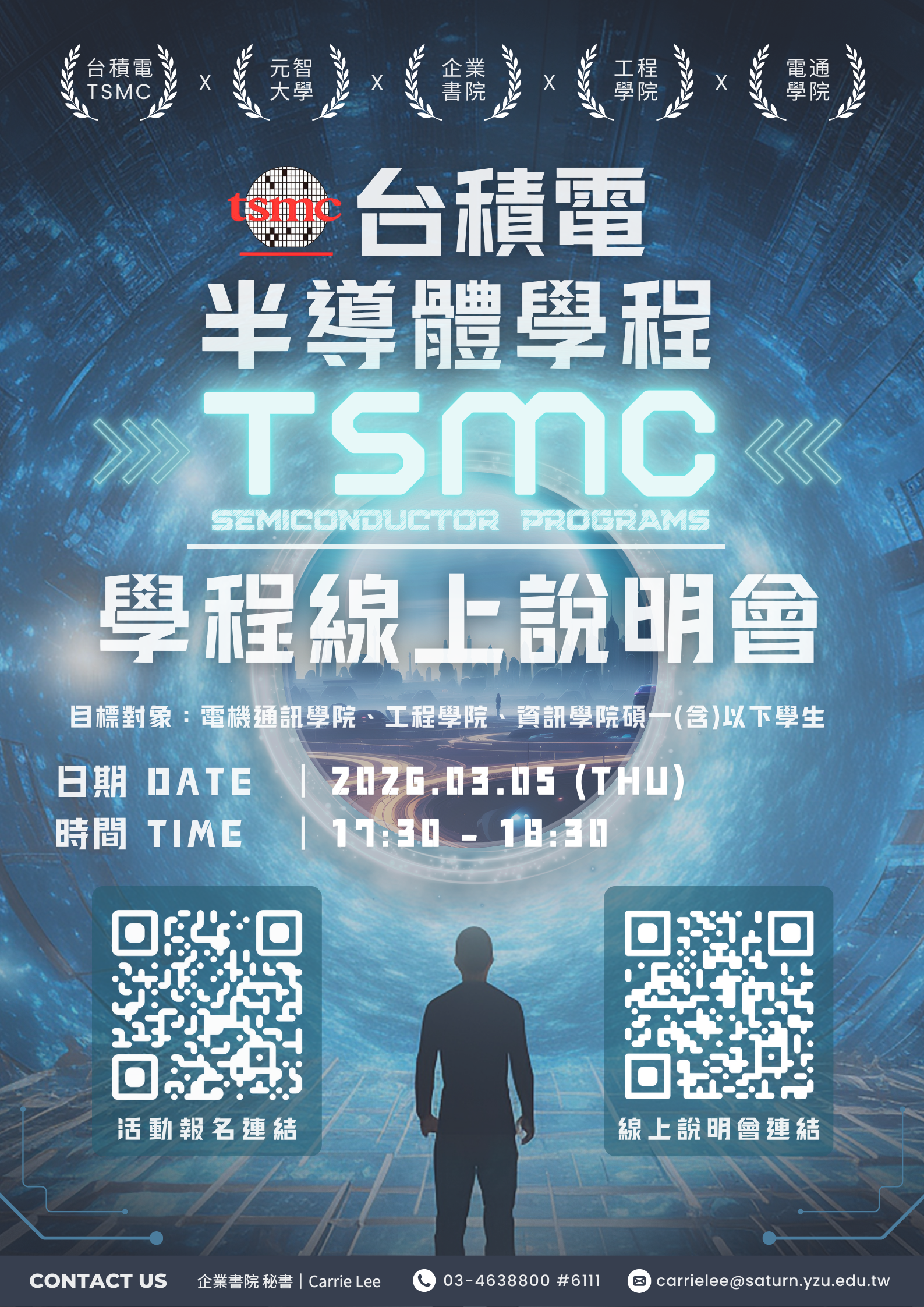 To help students strengthen their core competitiveness for semiconductor careers, Yuan Ze University has teamed up with TSMC to launch the Semiconductor Program. In this session, TSMC representatives will introduce the program and guide you through key industry trends and future career possibilities.