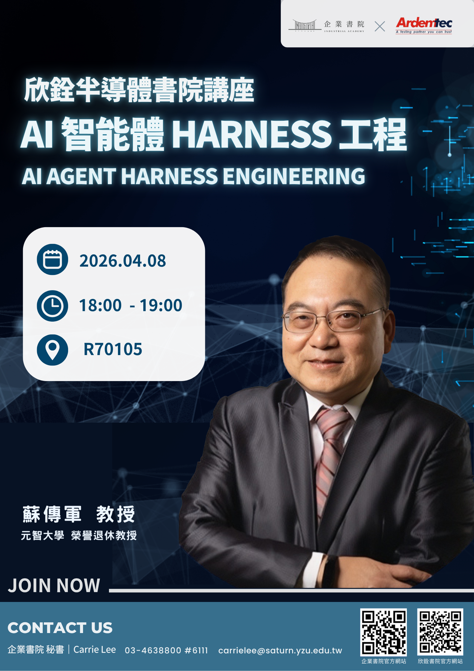 這一場企業書院再次重磅邀請 元智大學 榮譽退休教授 蘇傳軍教授 帶來精彩的演講!🔥 這次我們將更進一步,直擊 「AI 智能體 HARNESS 工程 (AI AGENT HARNESS ENGINEERING)」 的核心前沿架構!🔬