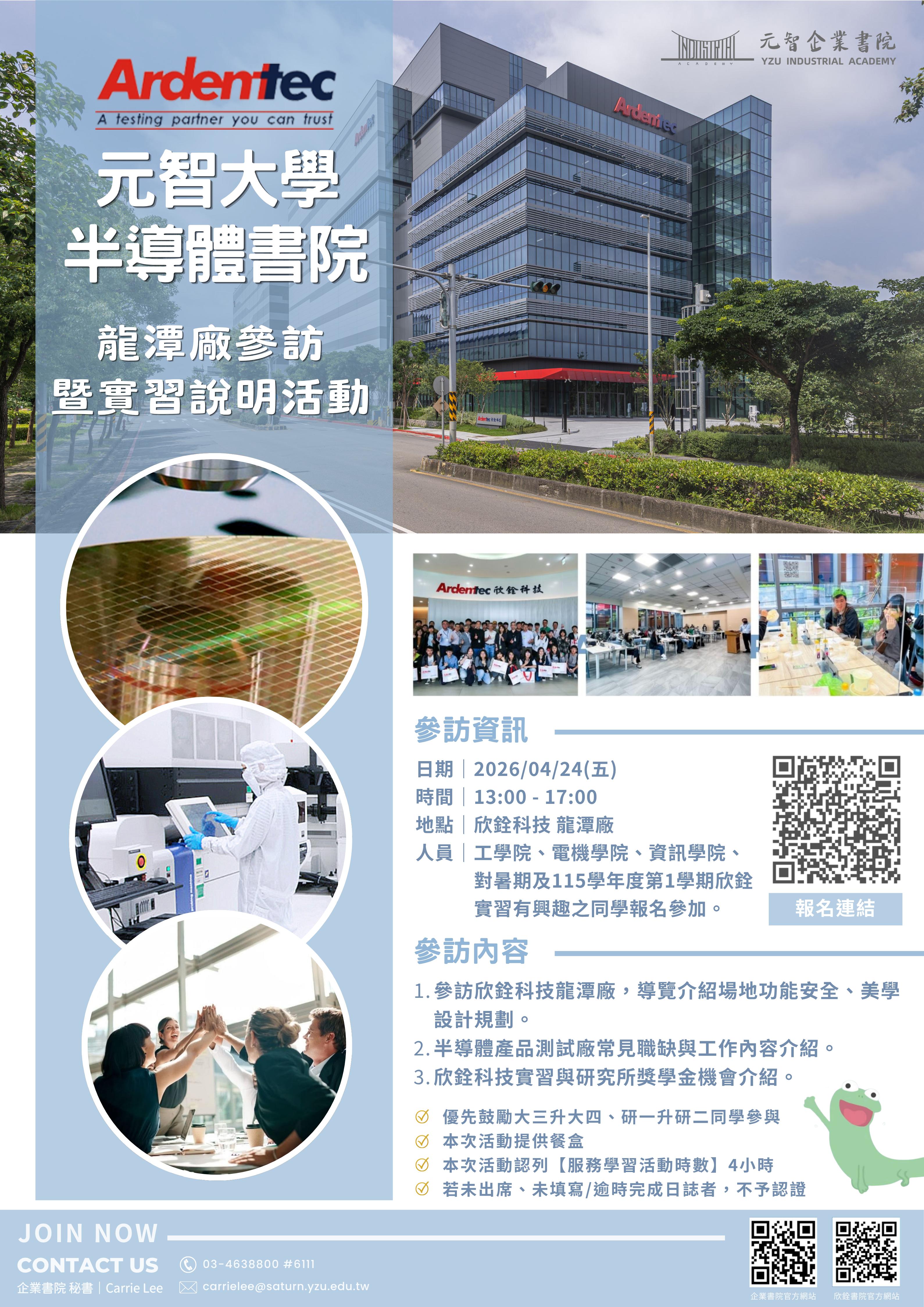 在全球半導體產業持續高速發展的浪潮中,欣銓科技身為國內領先的半導體測試服務公司,深耕晶圓與成品測試領域,並與國際大廠建立長期合作關係,持續推動產業技術與服務升級。本次參訪將帶領同學走進欣銓科技龍潭廠,實地了解半導體測試產業的運作模式與職場環境,並透過企業介紹與實習說明,協助同學提前掌握產業趨勢與職涯方向,為未來進入科技產業做好準備。