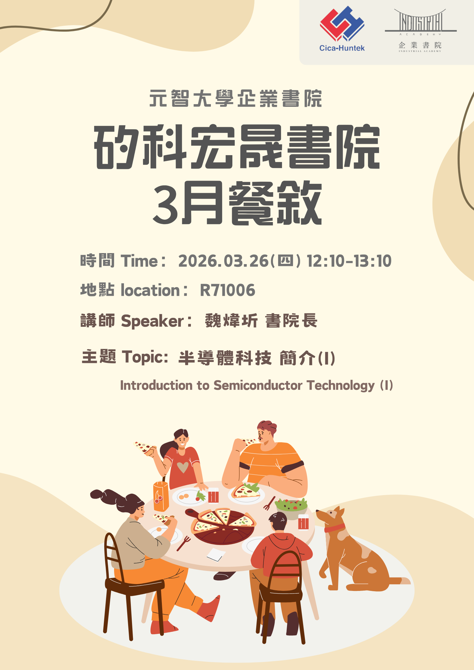 為促進書院成員之交流與共同成長,本院將於 3 月舉行書院餐敘活動。本次聚會特別邀請 魏煒圻 書院長 親自擔任主講人,以 「半導體科技 簡介(I)」 為題,帶領同學揭開半導體產業的神秘面紗。